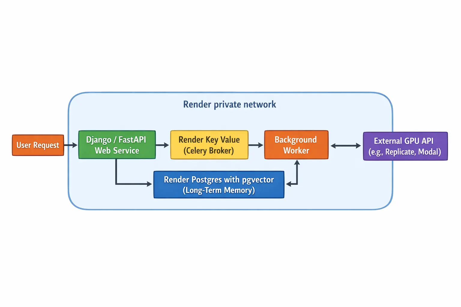 Render solves this by providing a unified platform where production-ready AI infrastructure works out of the box. Persistent background workers run complex tasks for hours, not minutes. Integrated databases with pgvector manage long-term memory. All components communicate securely over a zero-config private network.